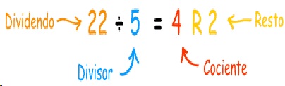 Tomemos el sencillo problema de dividir 22 entre 5. La respuesta es 4, y sobran 2. Aquí te mostramos los nombres más importantes: